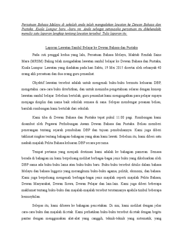 Contoh buku fiksyen ialah buku-buku cerita manakala. Contoh Karangan Laporan Stpm Bahasa. Anda sebagai setiausaha persatuan itu dikehendaki menulis satu laporan lengkap tentang lawatan tersebut.